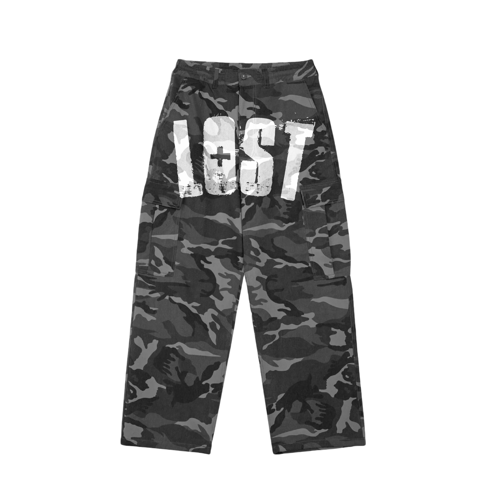 Custom cargos with hand-printed “LOST” branding. Limited color-ways, premium fit. Only 40 made in camo color-ways, 60 in other color-ways!